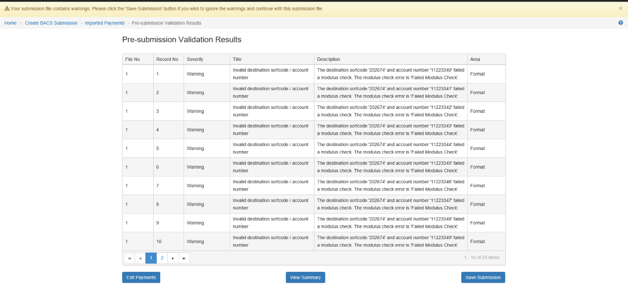 After the pre-submission validation has finished, the results are shown. The actual details on the screen will vary depending on the payment file being validated.