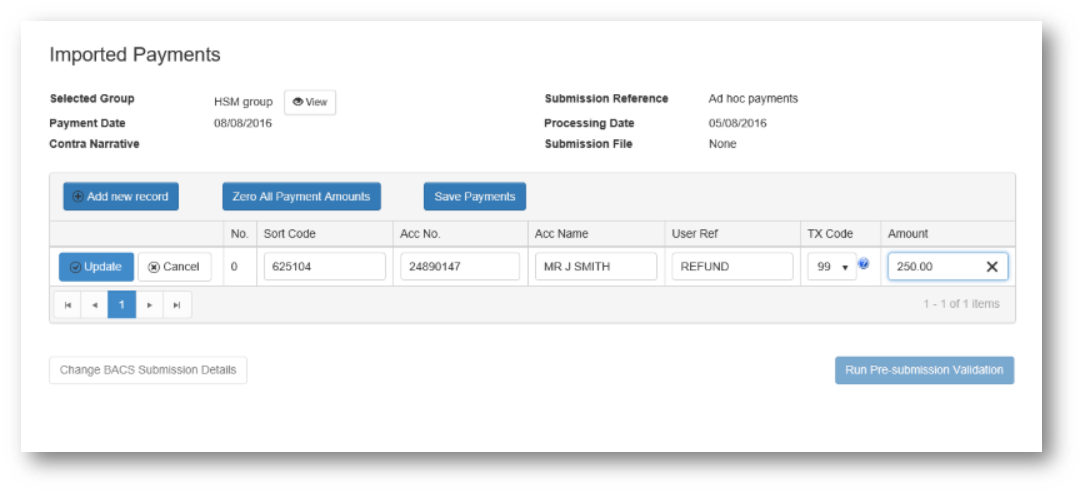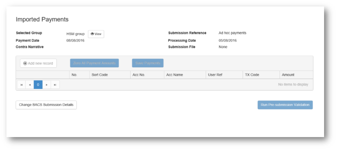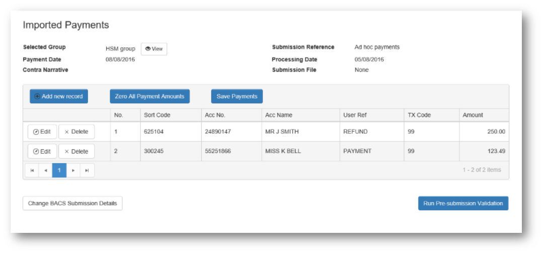 Clicking the "Run Pre-submission Validation" button will validate the payments prior to submitting the payment file to BACS.