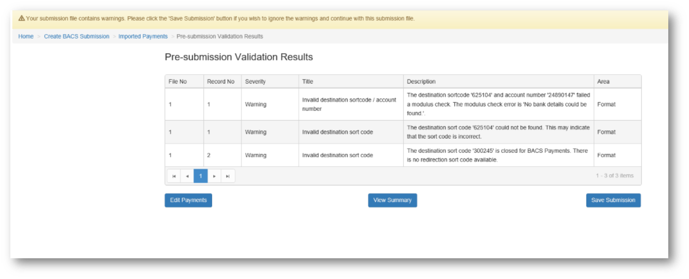 After the pre-submission validation has finished, the results are shown. The actual details on the screen will vary depending on the payment file being validated.