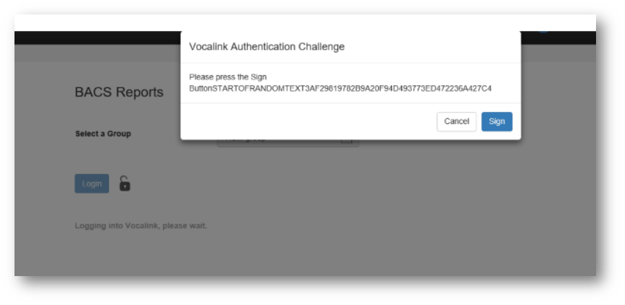 If the signing type of the selected group is HSM then when the user clicks the "Login" button, the BACS login challenge will be shown.
