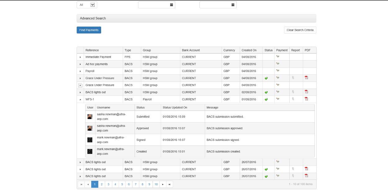 This page allows you to search for previously created payment submissions meaning you can review which payments were sent in a submission. You can also view the submission confirmation report.