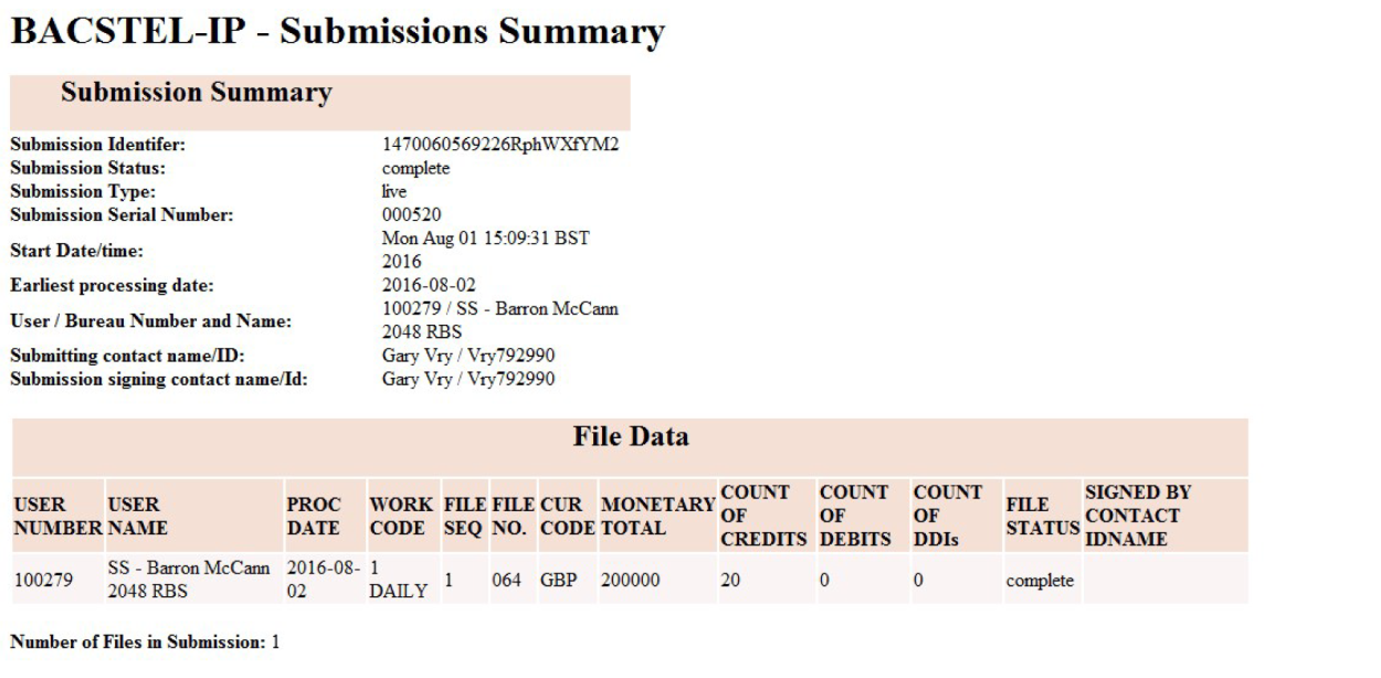Clicking on one of the icons in the "Report" column will show the submission confirmation report in a new browser tab or window as shown below.