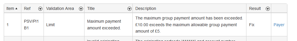 The specific reason for the pre-submission failure will be indicated in the results table. Serious errors that cannot be automatically fixed are marked as 'Fix' in the result column. This indicates that you need to fix the problem before PayGate will allow the submission to continue.