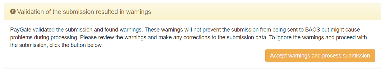 Warning - These are minor issues that you should be aware of. The submission will likely be accepted by BACS but the submission data may be amended by BACS in order to process the submission.