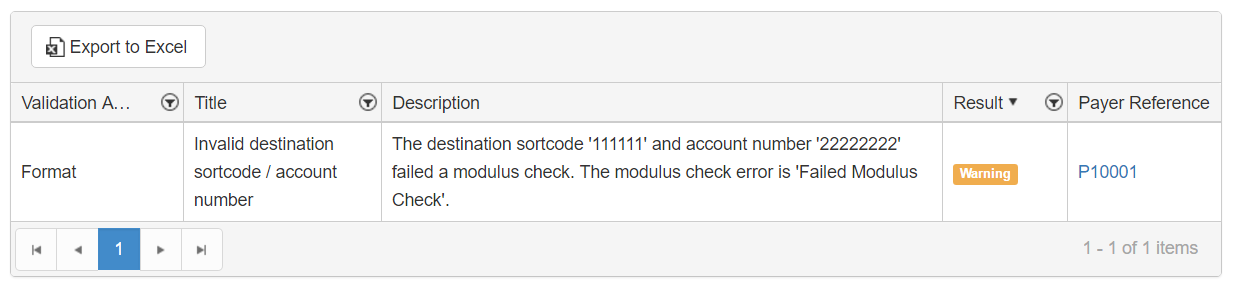 In this case a payer's sortcode and account number did not pass the validation process and may be invalid. At this point you can stop the submission and check the data. You may wish, in the case, to contact the payer and check they are provided the correct bank details.