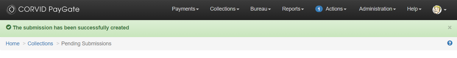 Proceeding with the submission process after the validation process will convert the collection data into a BACS formatted submission file ready for signing, approving and submission to BACS. If the submission was created correctly you will see a green bar telling you that the submission was created successfully.